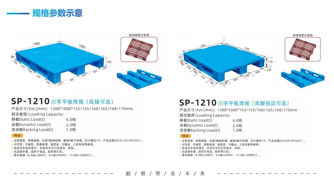 其规格为1200*1000*150mm,所以也可称之为1210川字平板塑料托盘;
